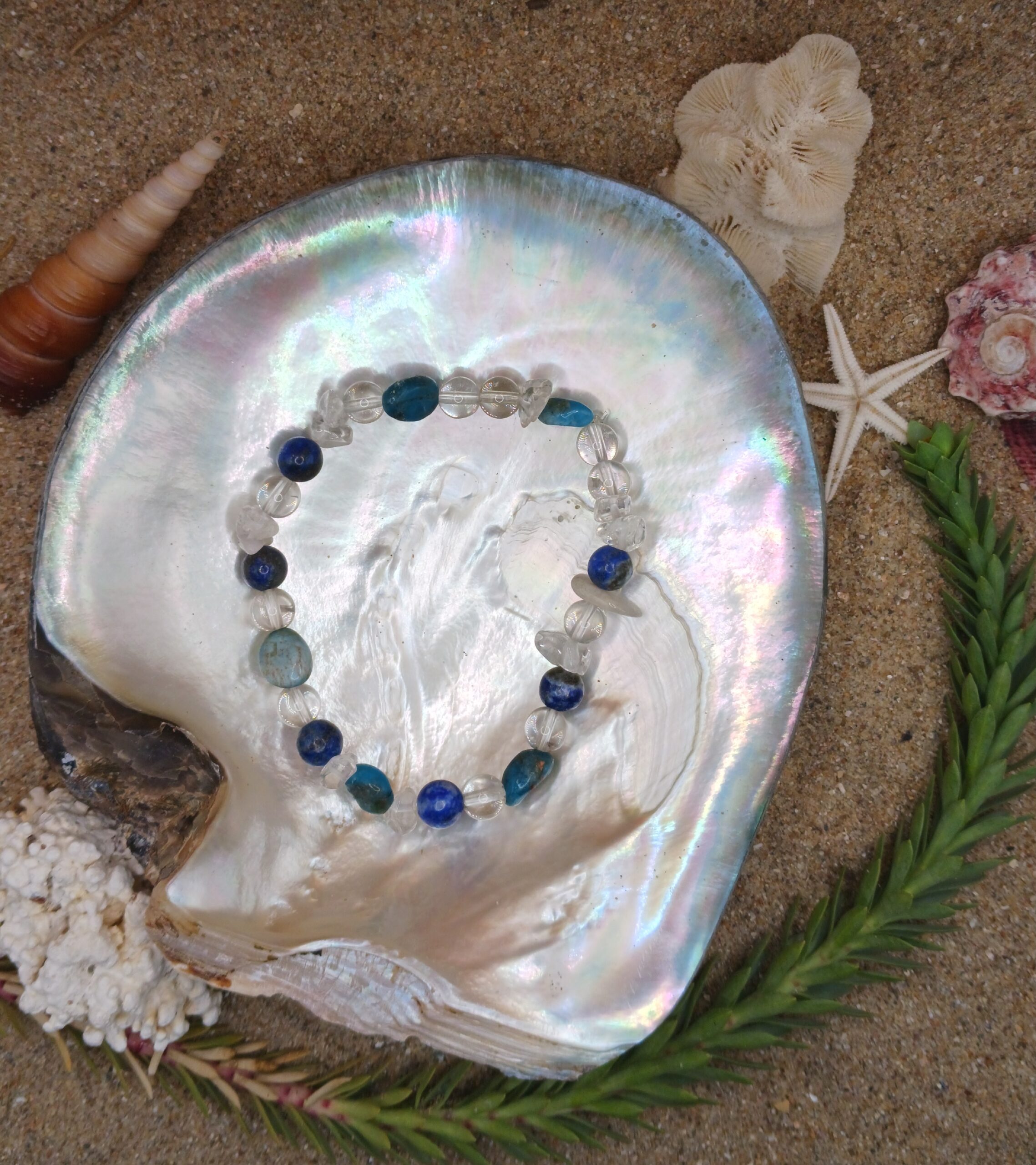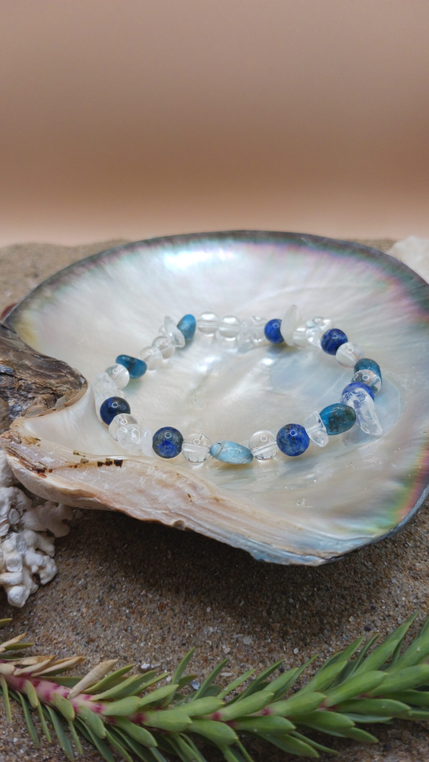 Lapiz Lazuli : Piqûres d’insectes, brûlures, fièvre et maux de tête, éruptions cutanées, évite les crampes et inflammations des bronches, du pharynx et des amygdales ; Stimule le thymus donc les défenses immunitaires ; Ne pas porter si hypotension